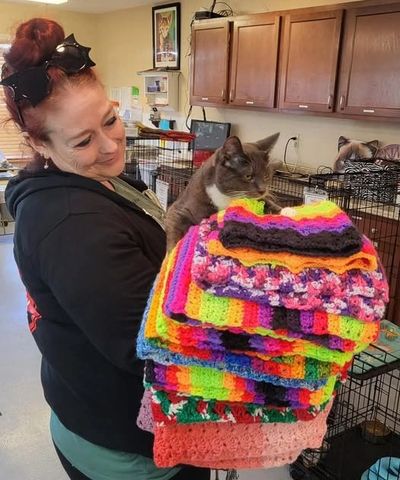 For cat bedding, we need new or clean gently-used small blankets and throws, knitted or crocheted small blankets, small fleece blankets or throws, and small to medium pet beds. If you are willing to knit/crochet or sew cage mats (approx. 24" x 24" or 20"x30" or similar size), it is always much appreciated, by us and by the cats!!